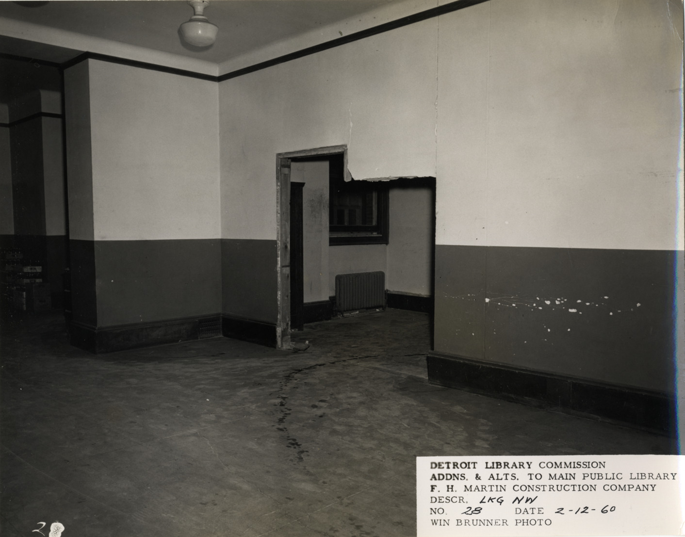 View of room in Main Library, Detroit Public Library during construction. Wall partially demolished to form doorway. Printed on front: "Detroit Library Commission. Addns. & alts. to Main Public Library. F.H. Martin Construction Company. Descr. lkg. nw. No. 28. Date: 2-12-60. Win Brunner, photo."