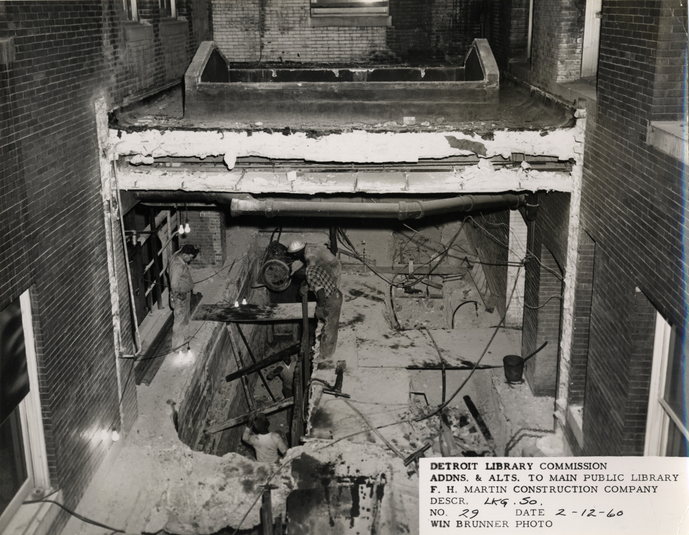 View of construction workers working in light court, Main Library, Detroit Public Library. Printed on front: "Detroit Library Commission. Addns. & alts. to Main Public Library. F.H. Martin Construction Company. Descr. lkg. so. No. 29. Date: 2-12-60. Win Brunner, photo."
