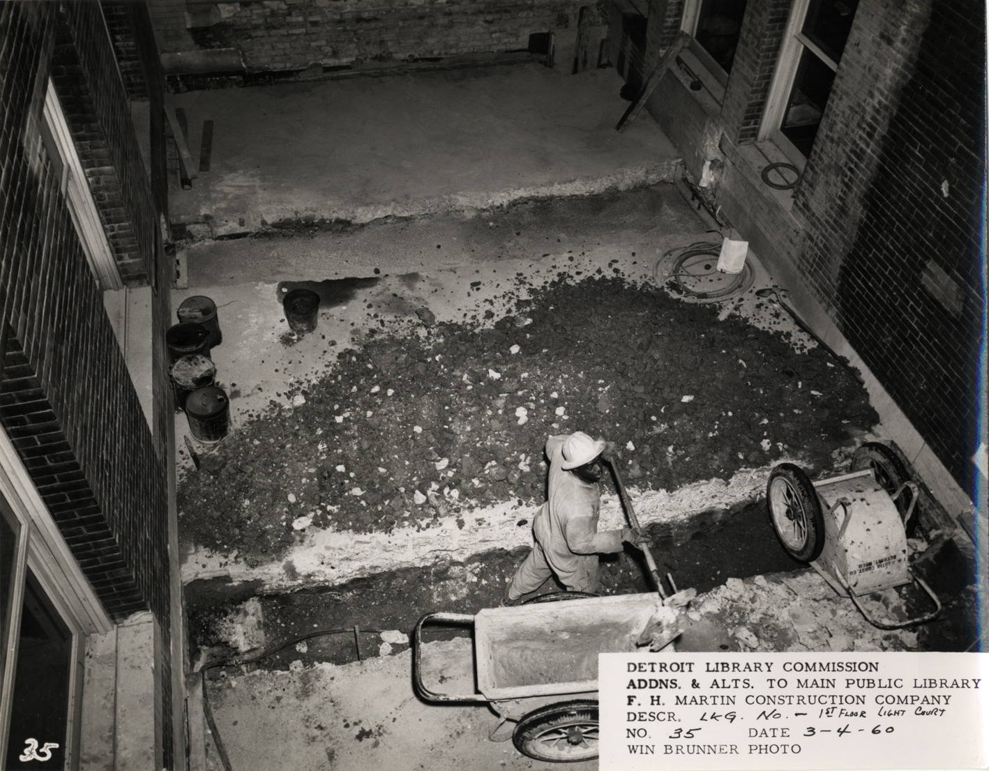 View of construction worker working in trench in first floor light court, Main Library, Detroit Public Library. Pile of debris adjacent to trench; wheelbarrows in foreground. Printed on front: "Detroit Library Commission. Addns. & alts. to Main Public Library. F.H. Martin Construction Company. Descr. lkg. no., 1st floor light court. No. 35. Date: 3-4-60. Win Brunner, photo."