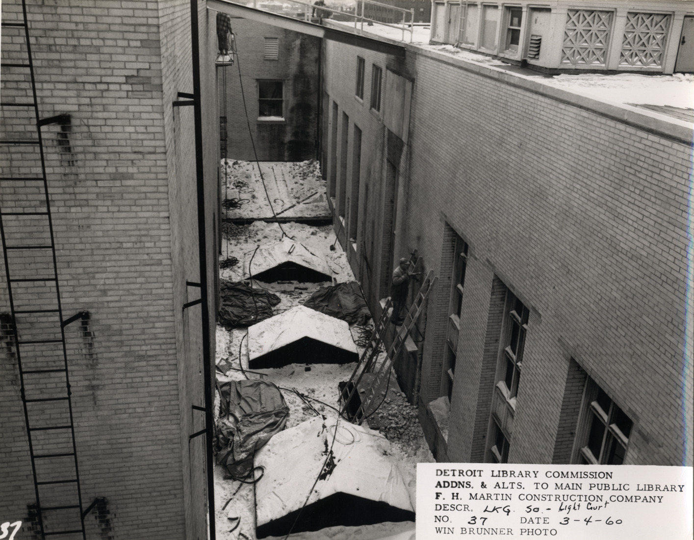 View of construction workers on scaffolding in light court, Main Library, Detroit Public Library. Ladders lean against exterior of building. Printed on front: "Detroit Library Commission. Addns. & alts. to Main Public Library. F.H. Martin Construction Company. Descr. lkg. so., light court. No. 37. Date: 3-4-60. Win Brunner, photo."