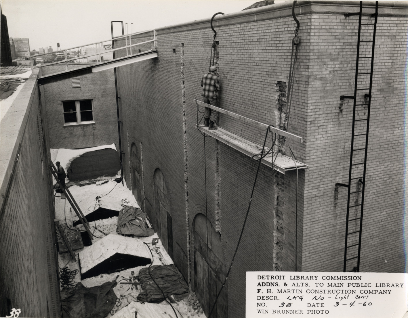 View of construction worker on scaffolding in light court, Main Library, Detroit Public Library. Another man stands on ladder; tarps on ground. Printed on front: "Detroit Library Commission. Addns. & alts. to Main Public Library. F.H. Martin Construction Company. Descr. lkg. no., light court. No. 38. Date: 3-4-60. Win Brunner, photo."