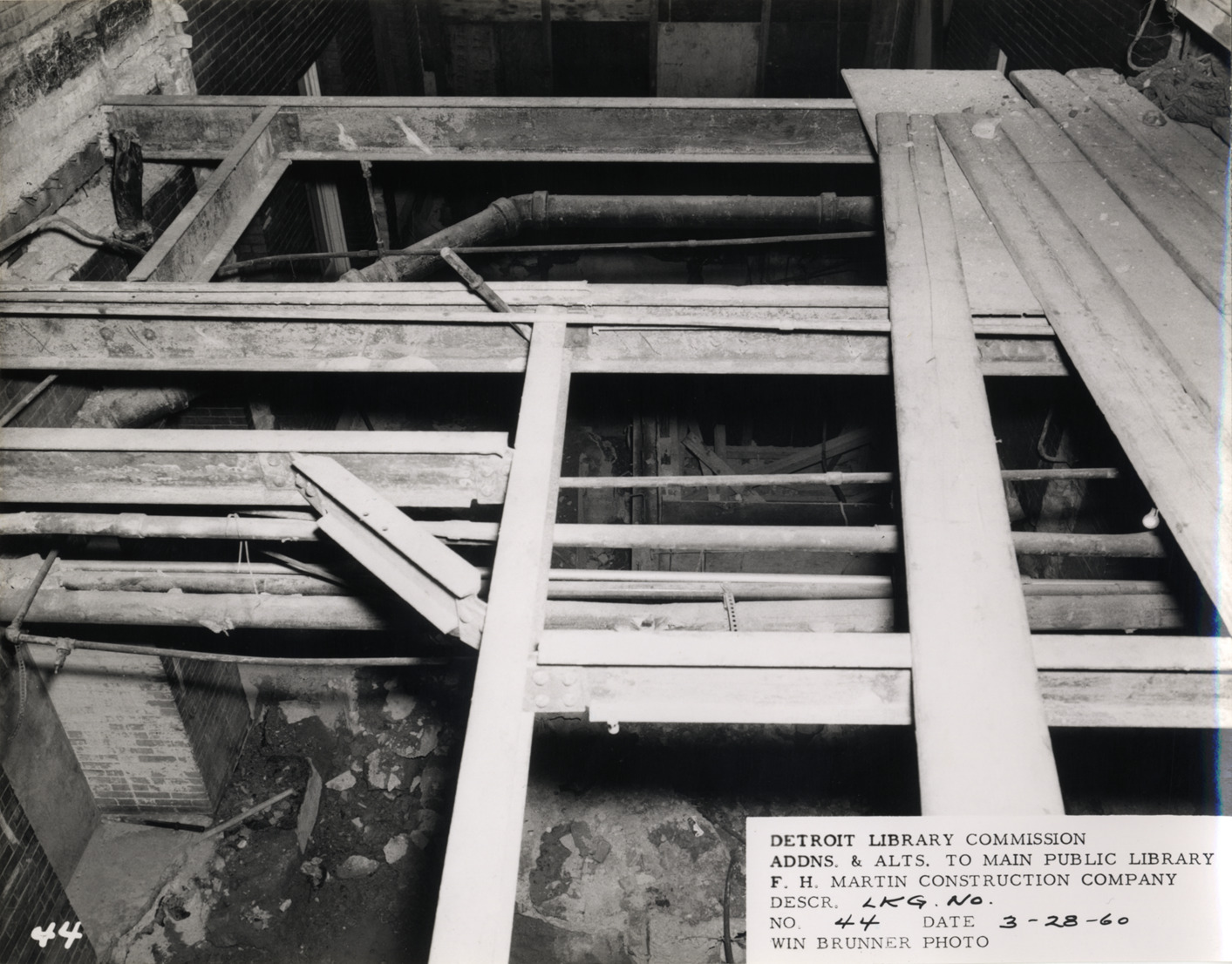View of floor beams of pump room balcony, Main Library, Detroit Public Library during construction. Printed on front: "Detroit Library Commission. Addns. & alts. to Main Public Library. F.H. Martin Construction Company. Descr. lkg. no. No. 44. Date: 3-28-60. Win Brunner, photo."