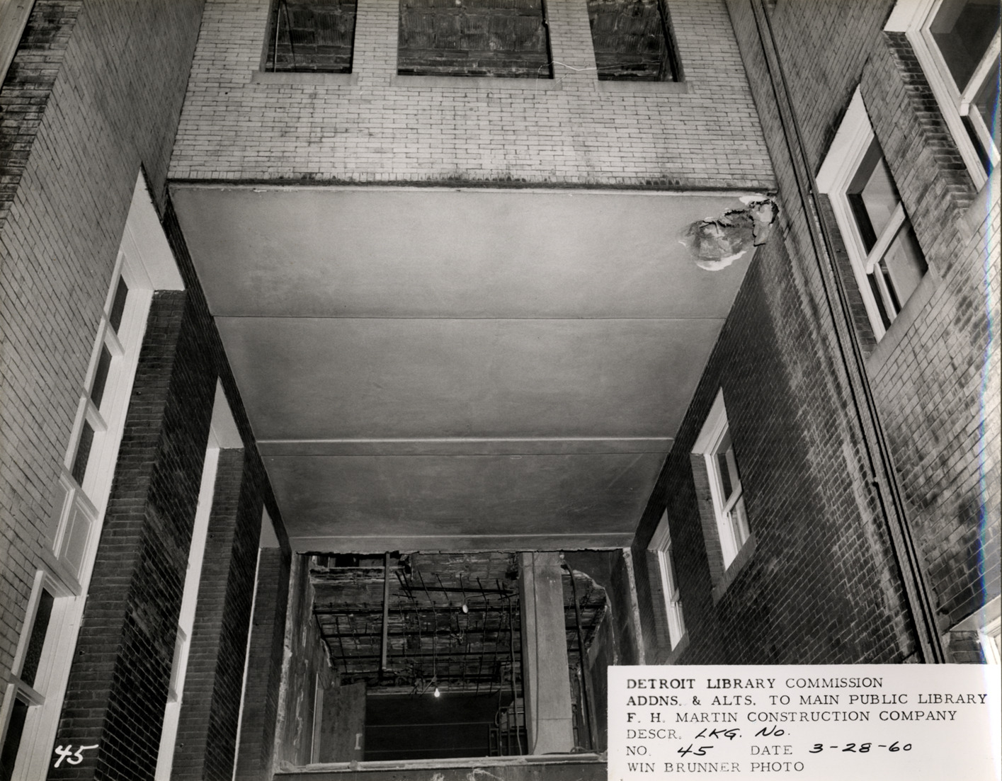 View of window wells in interior courtyard, Main Library, Detroit Public Library during construction. Printed on front: "Detroit Library Commission. Addns. & alts. to Main Public Library. F.H. Martin Construction Company. Descr. lkg. so. No. 45. Date: 3-28-60. Win Brunner, photo."