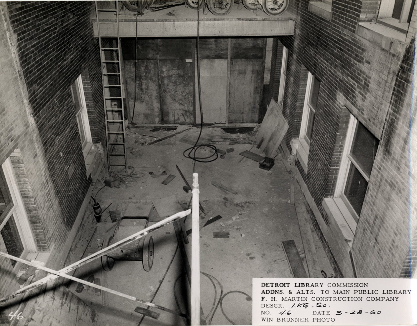 View of construction materials on floor of light court, Main Library, Detroit Public Library. Printed on front: "Detroit Library Commission. Addns. & alts. to Main Public Library. F.H. Martin Construction Company. Descr. lkg. so. No. 46. Date: 3-28-60. Win Brunner, photo."