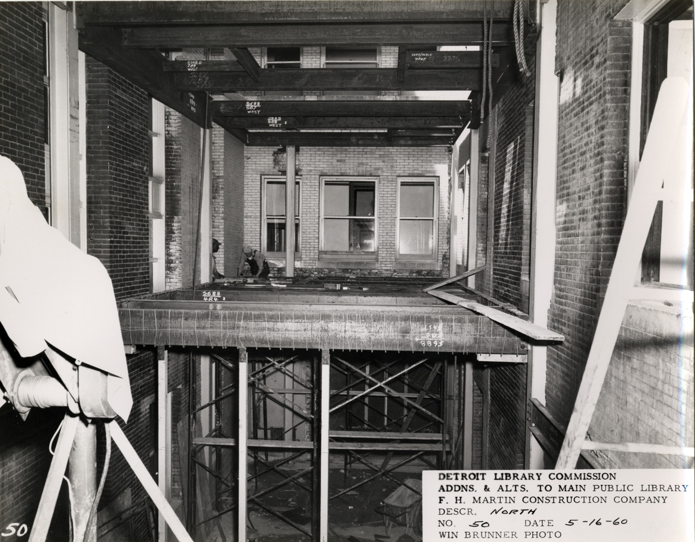 View of construction workers building structural framework inside light court, Main Library, Detroit Public Library. Printed on front: "Detroit Library Commission. Addns. & alts. to Main Public Library. F.H. Martin Construction Company. Descr. north. No. 50. Date: 5-16-60. Win Brunner, photo."