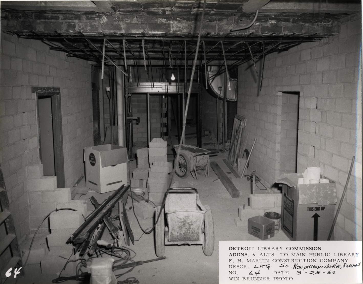 View of elevator in basement, Main Library, Detroit Public Library during construction. Wheelbarrows, boxes and construction materials in room. Printed on front: "Detroit Library Commission. Addns. & alts. to Main Public Library. F.H. Martin Construction Company. Descr. lkg. so., new passenger elevator, basement. No. 64. Date: 9-28-60. Win Brunner, photo."