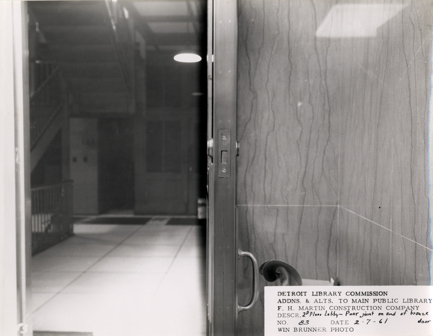 Close-up view of side of door in second floor lobby, Main Library, Detroit Public Library. Staircase in background. Printed on front: "Detroit Library Commission. Addns. & alts. to Main Public Library. F.H. Martin Construction Company. Descr. 2d floor lobby, poor joint on end of bronze door. No. 83. Date: 2-7-61. Win Brunner, photo."