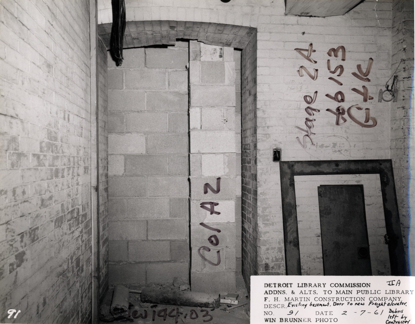 Close-up view of basement, Main Library, Detroit Public Library showing door to freight elevator. Debris on floor. Handwritten on front: "Elev. 144.03, col A2, stage 2A, job 153, G+K." Printed on front: "Detroit Library Commission. Addns. & alts. to Main Public Library. F.H. Martin Construction Company. Descr. existing basement, door to new freight elevator, debris left by contractor, IIA. No. 91. Date: 2-7-61. Win Brunner, photo."