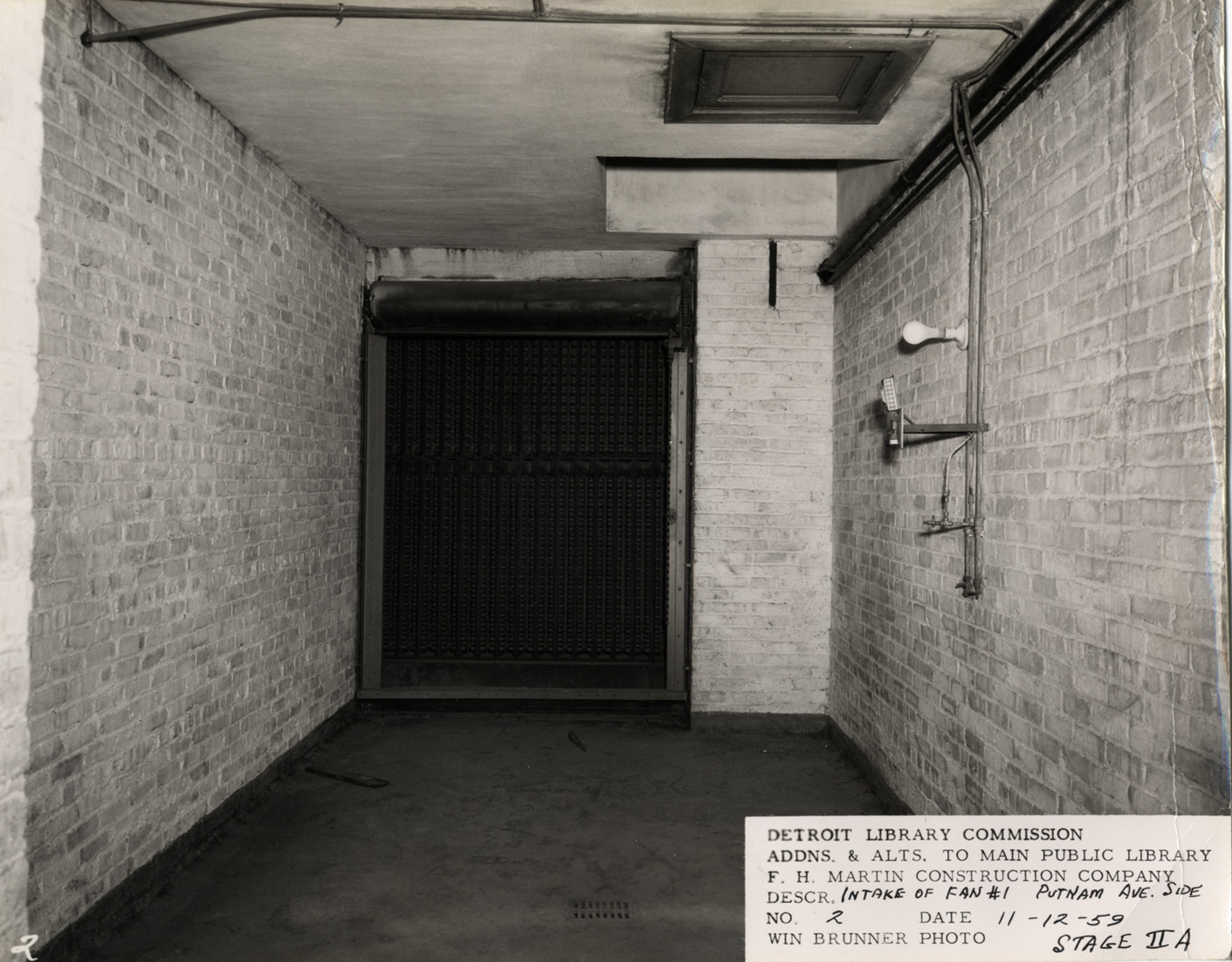 View of intake fan #1, Main Library, Detroit Public Library. Printed on front: "Detroit Library Commission. Addns. & alts. to Main Public Library. F.H. Martin Construction Company. Descr. intake fan #1, Putnam Ave. side, stage IIA. No. 2. Date: 11-12-59. Win Brunner, photo."