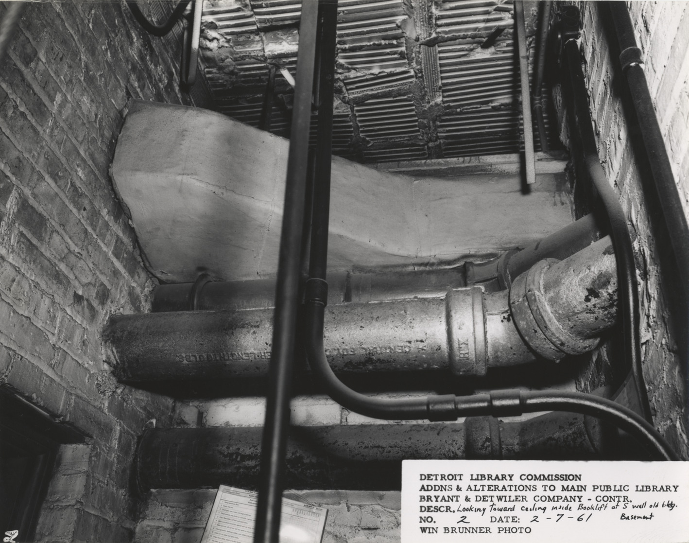 Close-up view of air duct and sewer pipe, Main Library, Detroit Public Library during construction. Printed on front: "Detroit Library Commission. Addns & alterations to Main Public Library. Bryant & Detwiler Company, contr. Descr. looking toward ceiling inside booklift at s. wall, old bldg. No. 2. Date: 2-7-61. Win Brunner, photo."