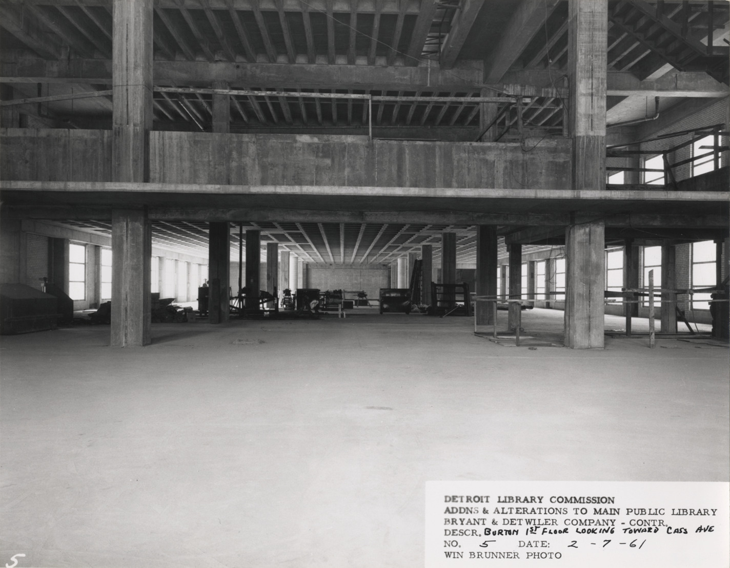 View of Burton Historical Collection, Main Library, Detroit Public Library, during construction. Printed on front: "Detroit Library Commission. Addns & alterations to Main Public Library. Bryant & Detwiler Company, contr. Descr. Burton 1st floor looking toward Cass Ave. No. 5. Date: 2-7-61. Win Brunner, photo."
