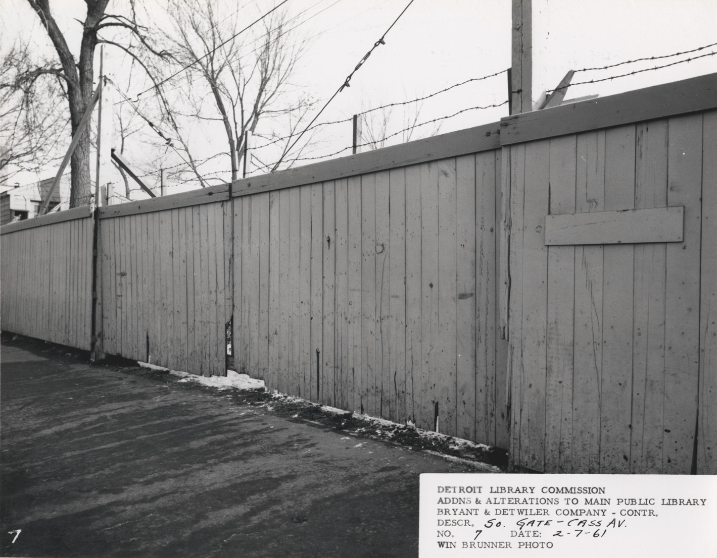 View of south gate, Cass Ave., Main Library, Detroit Public Library. Wooden fence with barbed wire across top. Printed on front: "Detroit Library Commission. Addns & alterations to Main Public Library. Bryant & Detwiler Company, contr. Descr. so gate, Cass Av. No. 7. Date: 2-7-61. Win Brunner, photo."