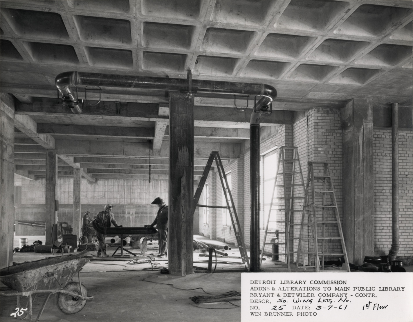 View of two construction workers assembling pipe on first floor of South Wing, Main Library, Detroit Public Library. Ladders, wheelbarrow and sections of pipe in room. Printed on front: "Detroit Library Commission. Addns & alterations to Main Public Library. Bryant & Detwiler Company, contr. Descr. So. Wing, lkg. no., 1st floor. No. 25. Date: 3-7-61. Win Brunner, photo."