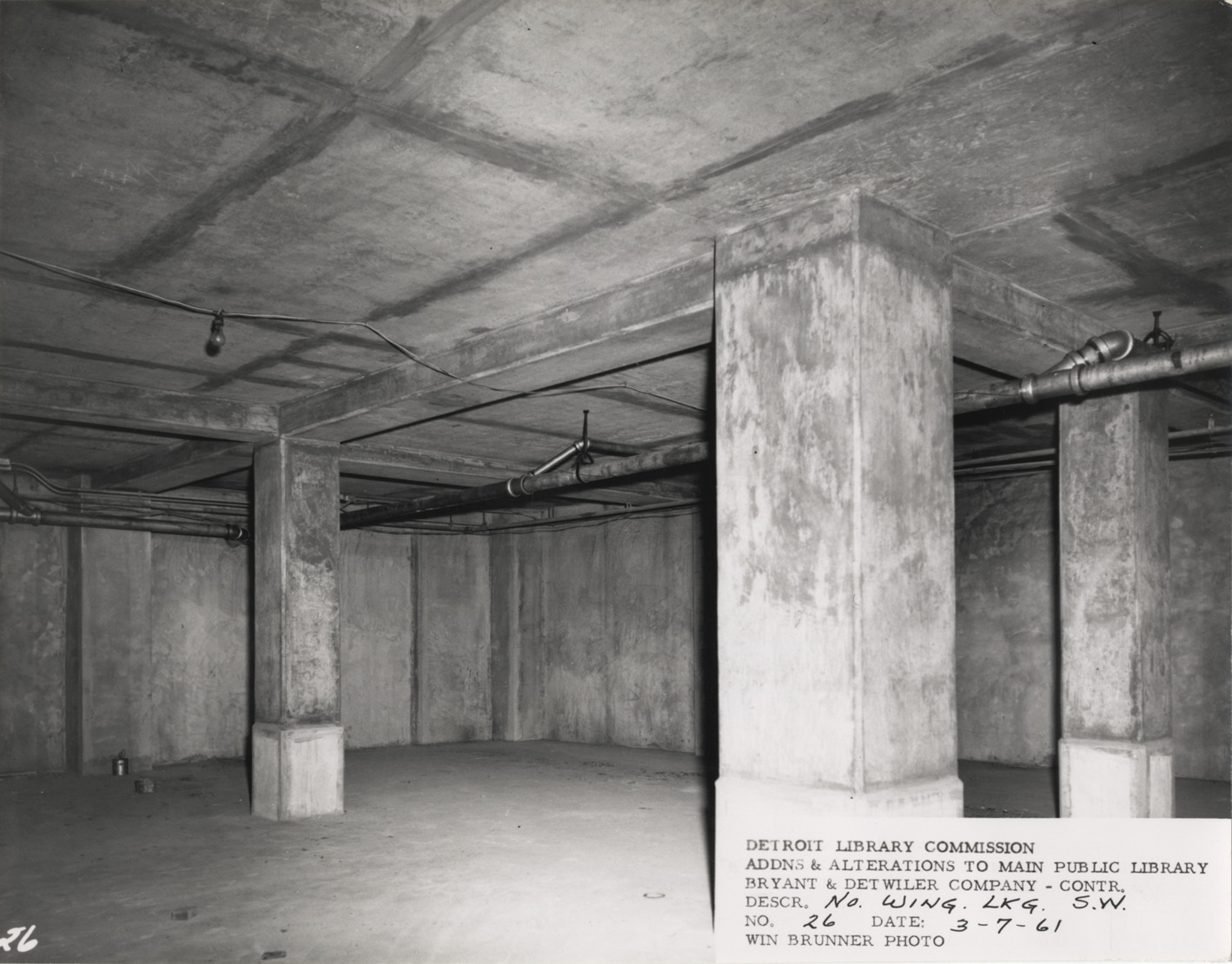 Interior view of North Wing, Main Library, Detroit Public Library during construction. Basement area with pipes overhead and concrete columns. Printed on front: "Detroit Library Commission. Addns & alterations to Main Public Library. Bryant & Detwiler Company, contr. Descr. No. Wing, lkg. s.w. No. 26. Date: 3-7-61. Win Brunner, photo."