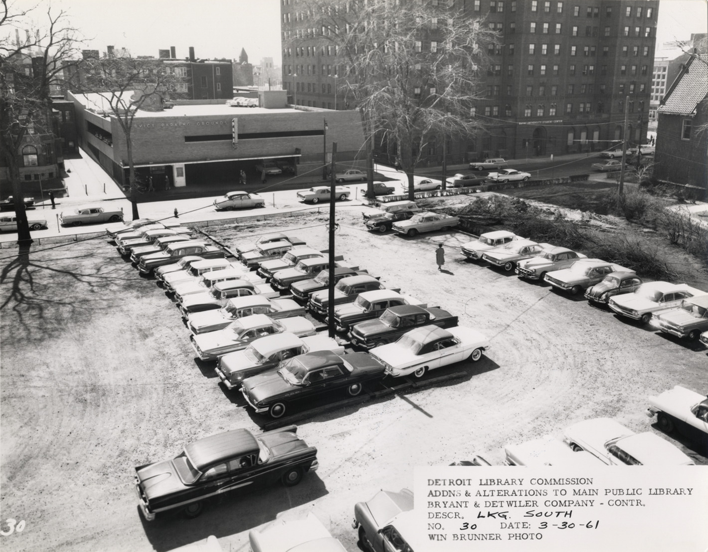 View of parking lot on south side of Main Library, Detroit Public Library. Automobiles parked in lot; parking garage and Wayne State University Student Center across street. Printed on front: "Detroit Library Commission. Addns & alterations to Main Public Library. Bryant & Detwiler Company, contr. Descr. lkg. south. No. 30. Date: 3-30-61. Win Brunner, photo."