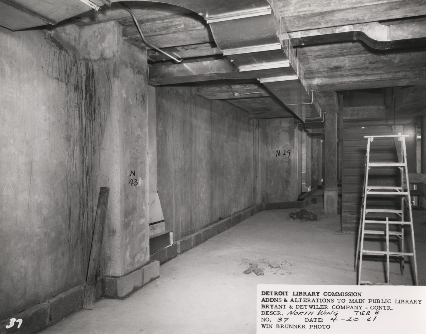 View of B-level, North Wing, Main Library, Detroit Public Library during construction. Ductwork overhead; stairs in background. Ladder in foreground. Handwritten on columns: "N43; N29." Printed on front: "Detroit Library Commission. Addns & alterations to Main Public Library. Bryant & Detwiler Company, contr. Descr. North Wing, tier B. No. 37. Date: 4-20-61. Win Brunner, photo."