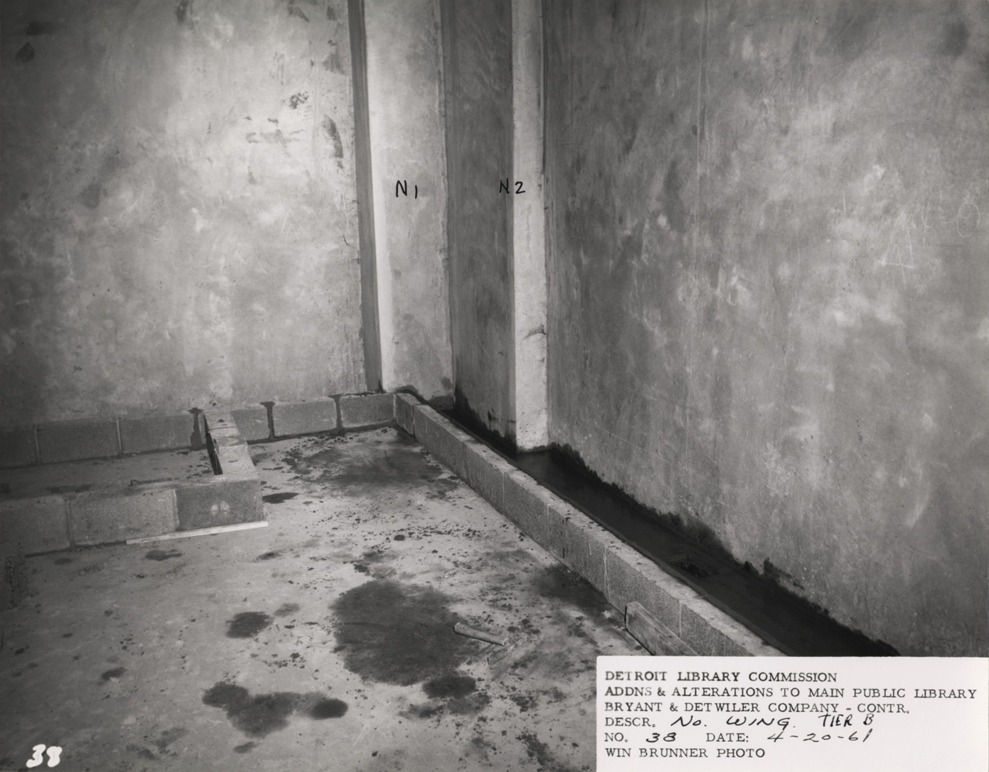 View of corner of room on B-level, North Wing, Main Library, Detroit Public Library during construction. Handwritten on corner columns: "N1; N2." Printed on front: "Detroit Library Commission. Addns & alterations to Main Public Library. Bryant & Detwiler Company, contr. Descr. No. Wing, tier B. No. 38. Date: 4-20-61. Win Brunner, photo."
