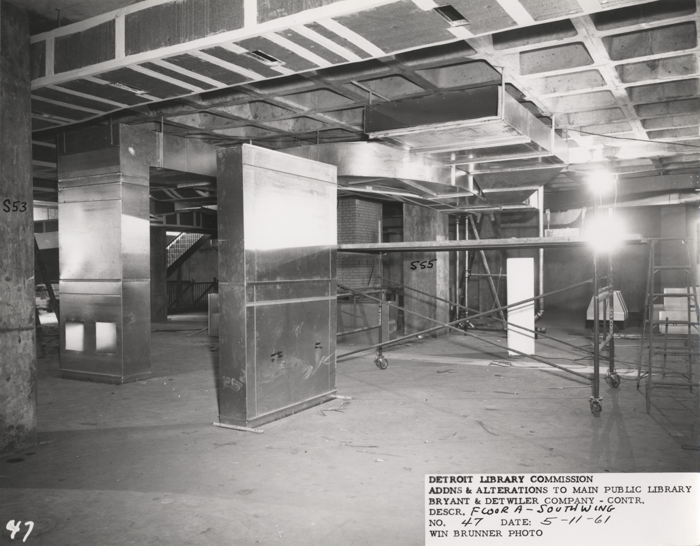 View of A-level, South Wing, Main Library, Detroit Public Library during construction. Ductwork partially installed; scaffolding in center of room. Handwritten on columns: "S53; S55." Printed on front: "Detroit Library Commission. Addns & alterations to Main Public Library. Bryant & Detwiler Company, contr. Descr. Floor A, South Wing. No. 47. Date: 5-11-61. Win Brunner, photo."