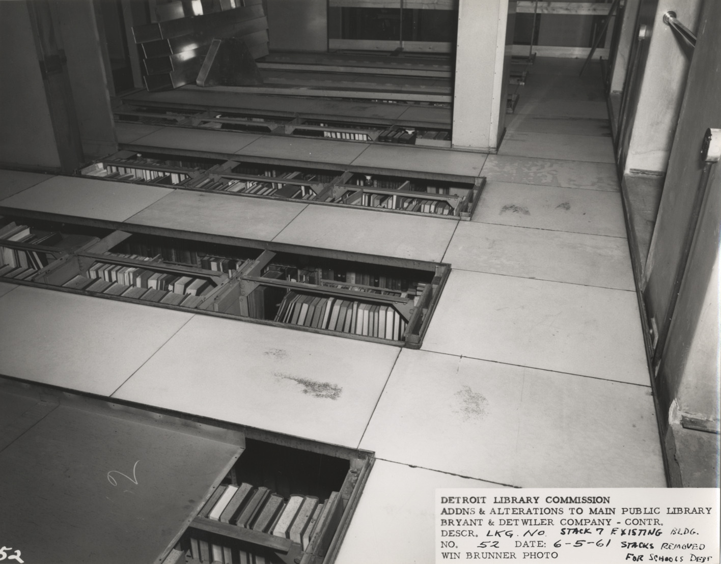 View of Stack 7 in Main Library, Detroit Public Library. Shelves have been removed; books on shelves on lower level visible through openings in floor. Printed on front: "Detroit Library Commission. Addns & alterations to Main Public Library. Bryant & Detwiler Company, contr. Descr. lkg. no., Stack 7, existing bldg., stacks removed for Schools Dept. No. 52. Date: 6-5-61. Win Brunner, photo."