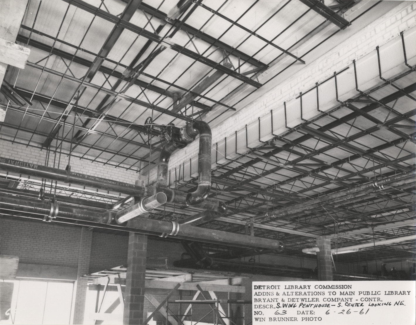 View towards ceiling of penthouse, South Wing, Main Library, Detroit Public Library. Pipes installed in ceiling. Printed on front: "Detroit Library Commission. Addns & alterations to Main Public Library. Bryant & Detwiler Company, contr. Descr. S. Wing penthouse, s. center looking n.e. No. 63. Date: 6-26-61. Win Brunner, photo."
