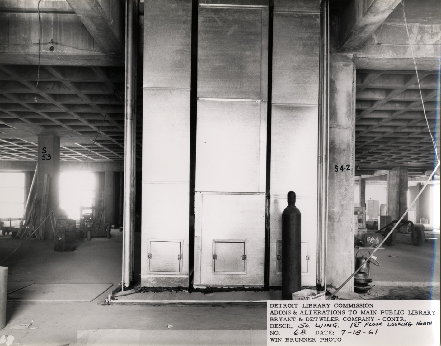 View of air ducts on first floor, South Wing, Main Library, Detroit Public Library during construction. Handwritten on front: "S42." Printed on front: "Detroit Library Commission. Addns & alterations to Main Public Library. Bryant & Detwiler Company, contr. Descr. So. Wing, 1st floor looking north. No. 68. Date: 7-18-61. Win Brunner, photo."
