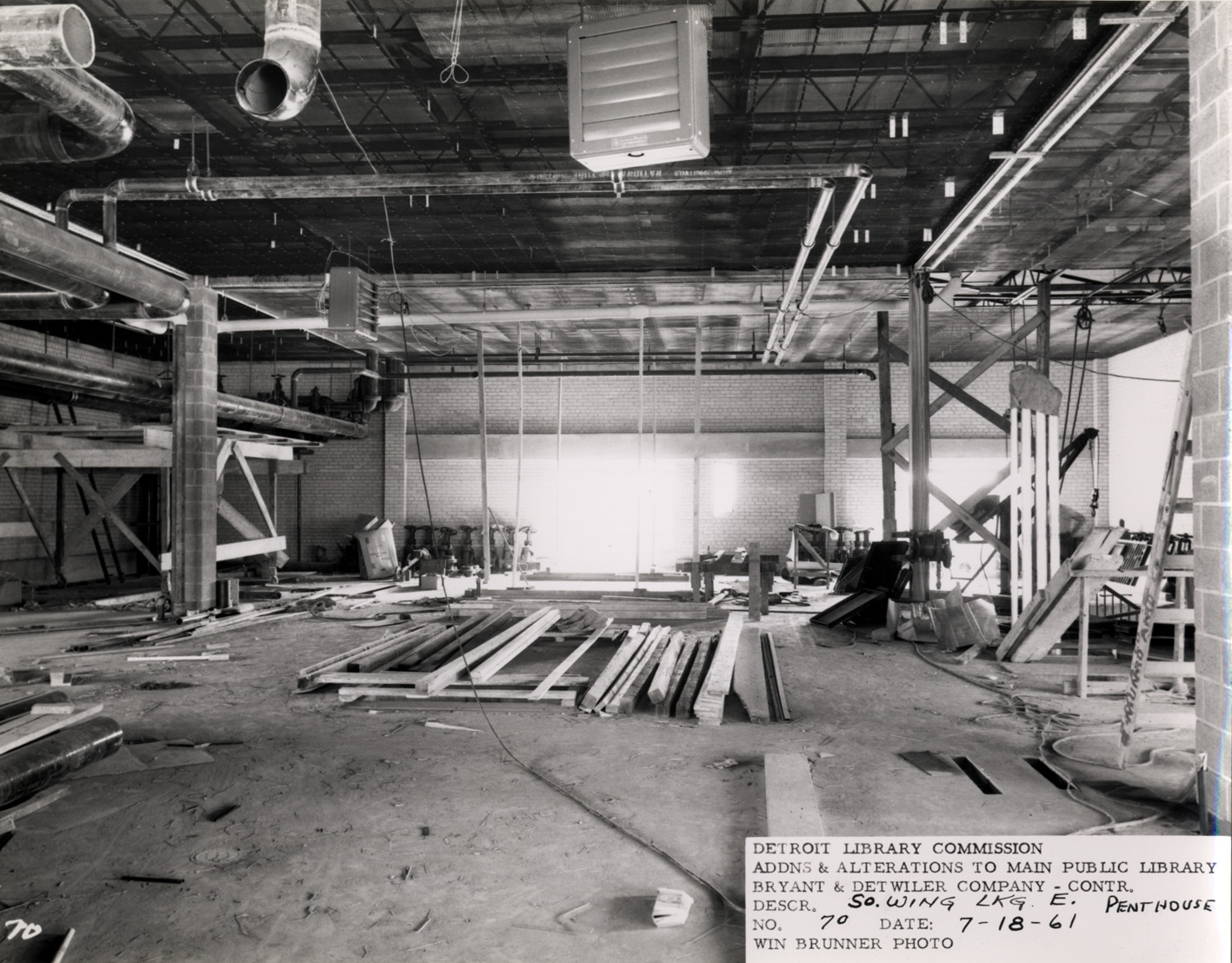 View of penthouse, South Wing, Main Library, Detroit Public Library during construction. Pipes and fans installed overhead; lumber and building materials on floor. Printed on front: "Detroit Library Commission. Addns & alterations to Main Public Library. Bryant & Detwiler Company, contr. Descr. So. Wing lkg. e. penthouse. No. 70. Date: 7-18-61. Win Brunner, photo."