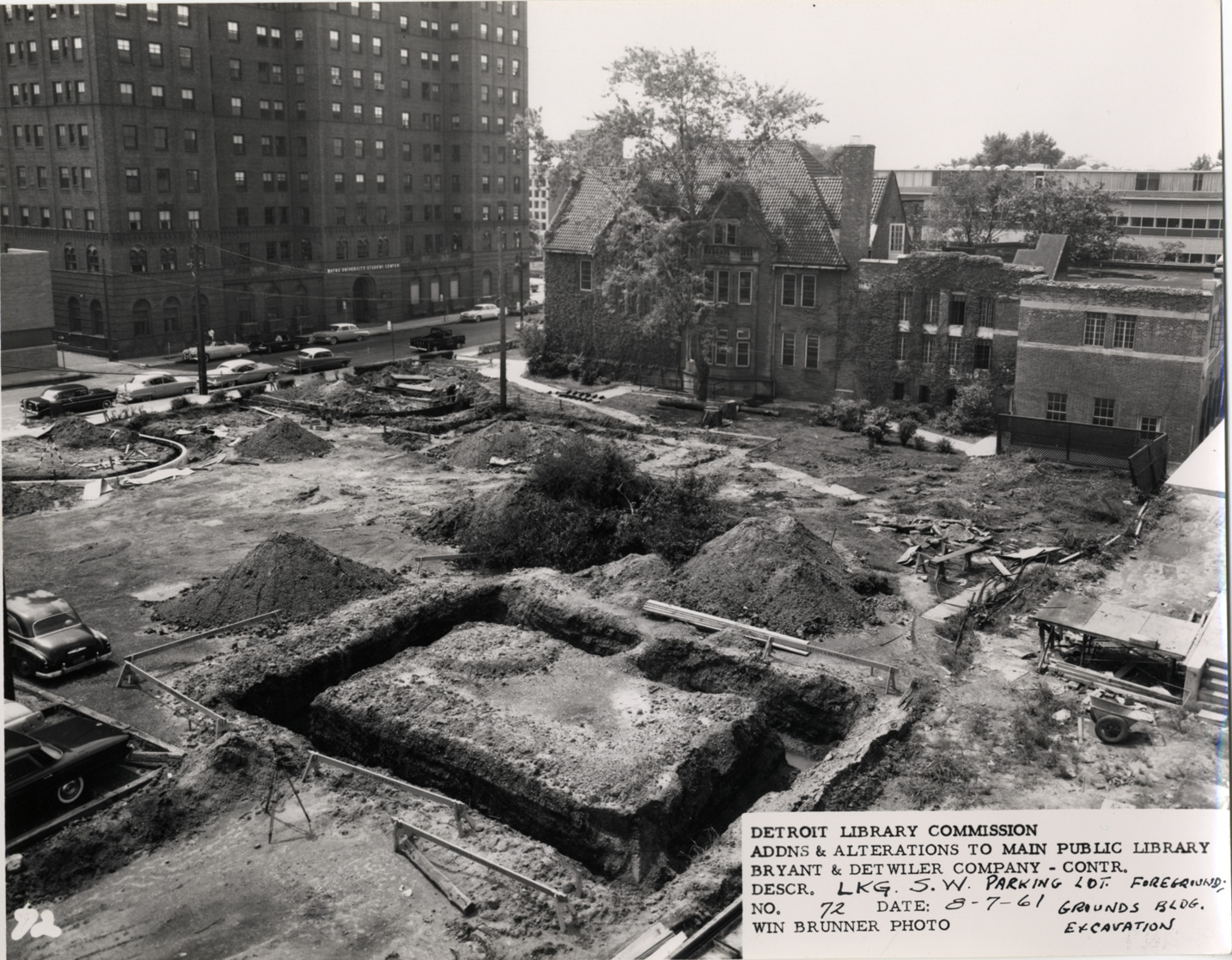 View of excavation for Grounds Building adjacent to South Wing, Main Library, Detroit Public Library during construction. Old Technology Building in background. Printed on front: "Detroit Library Commission. Addns & alterations to Main Public Library. Bryant & Detwiler Company, contr. Descr. lkg. s.w. parking lot foreground; Grounds Bldg. excavation. No. 72. Date: 8-7-61. Win Brunner, photo."