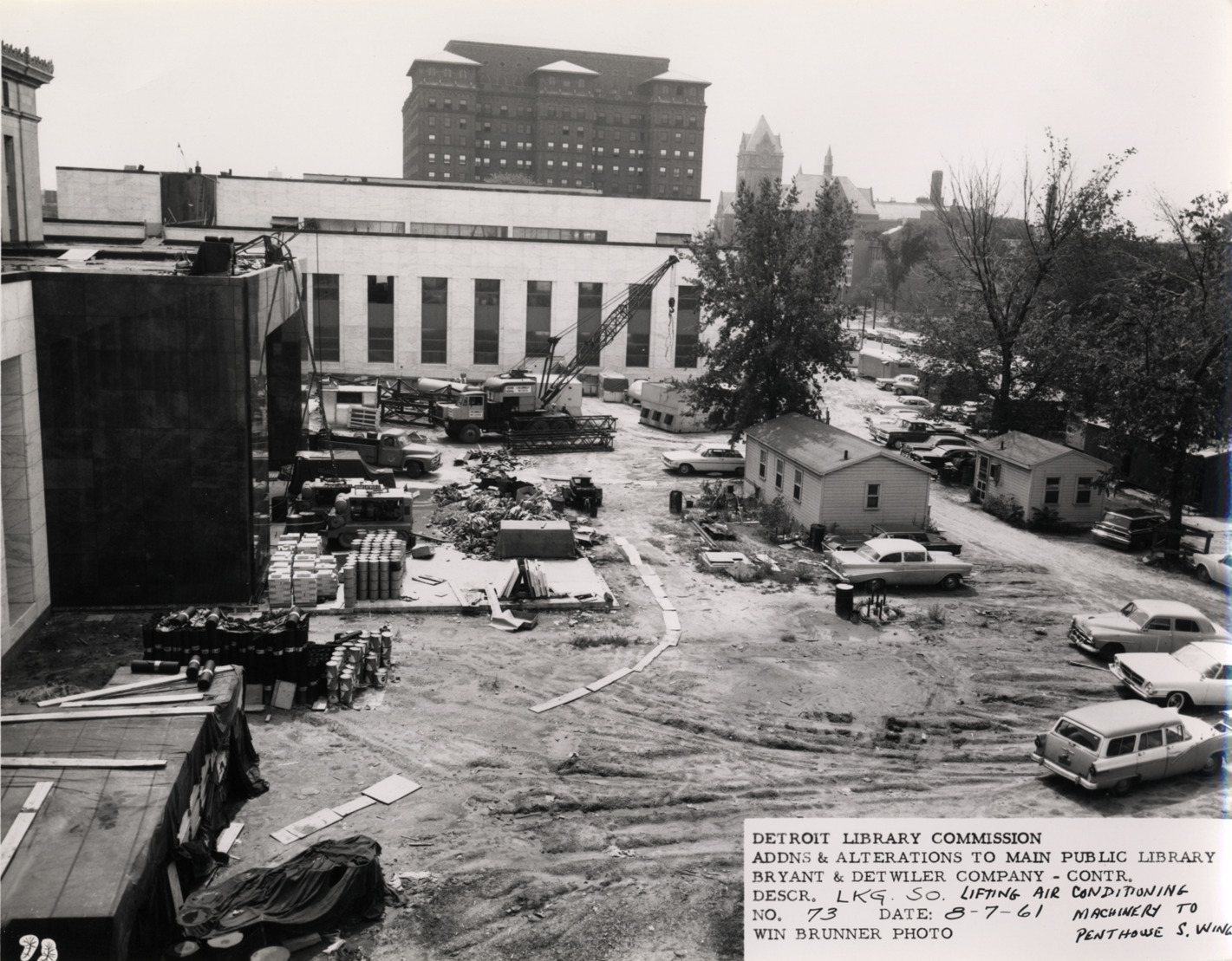 View of air conditioning machinery being lifted to South Wing penthouse, Main Library, Detroit Public Library during construction. Automobiles, construction materials, outbuildings and crane on construction site. Printed on front: "Detroit Library Commission. Addns & alterations to Main Public Library. Bryant & Detwiler Company, contr. Descr. lkg. so. lifting air conditioning machinery to penthouse, S. Wing. No. 73. Date: 8-7-61. Win Brunner, photo."