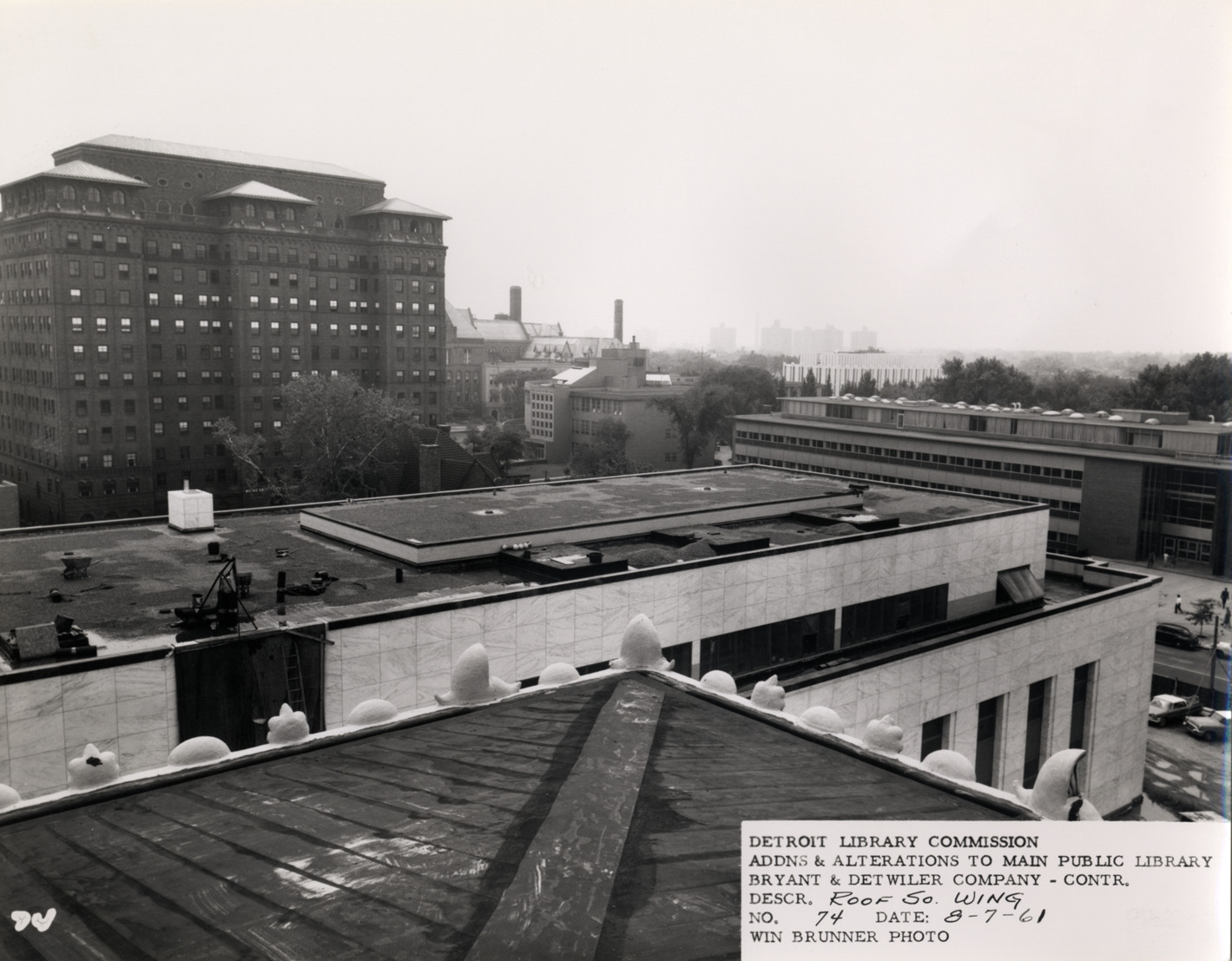 View of roof of South Wing, Main Library, Detroit Public Library. Printed on front: "Detroit Library Commission. Addns & alterations to Main Public Library. Bryant & Detwiler Company, contr. Descr. roof, so. wing. No. 74. Date: 8-7-61. Win Brunner, photo."