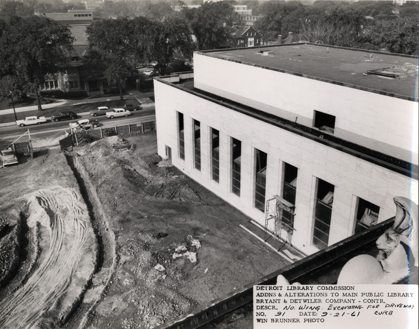 Bird's-eye view of excavation for driveway curb adjacent to North Wing, Main Library, Detroit Public Library. Printed on front: "Detroit Library Commission. Addns & alterations to Main Public Library. Bryant & Detwiler Company, contr. Descr. No. Wing, excavating for driveway curb. No. 91. Date: 9-21-61. Win Brunner, photo."