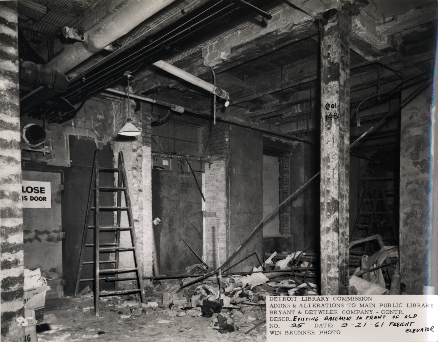View of basement area in front of old freight elevator, Main Library, Detroit Public Library during construction. Ladder leans against wall; construction debris on floor. Handwritten on column: "Col. 148." Printed on front: "Detroit Library Commission. Addns & alterations to Main Public Library. Bryant & Detwiler Company, contr. Descr. existing basement in front of old freight elevator. No. 95. Date: 9-21-61. Win Brunner, photo."