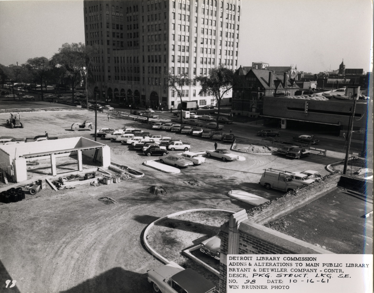 View of automobiles parked in unpaved parking lot, Main Library, Detroit Public Library during construction. Framework of parking garage for Grounds Building on left. Printed on front: "Detroit Library Commission. Addns & alterations to Main Public Library. Bryant & Detwiler Company, contr. Descr. pkg. struct. lkg. s.e. No. 98. Date: 10-16-61. Win Brunner, photo."