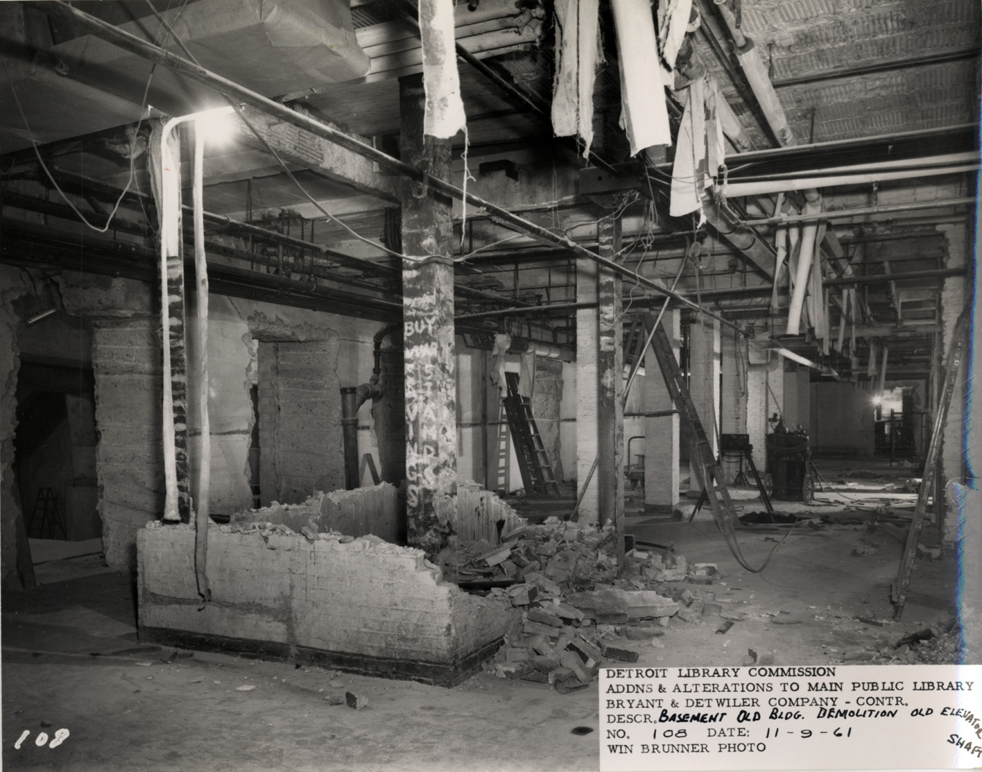 View of old elevator shaft demolition in basement, Main Library, Detroit Public Library. Debris on floor. Printed on front: "Detroit Library Commission. Addns & alterations to Main Public Library. Bryant & Detwiler Company, contr. Descr. basement old bldg., demolition old elevator shaft. No. 108. Date: 11-9-61. Win Brunner, photo." Handwritten on back: "Note: Buy war savings stamps on column, World War I."