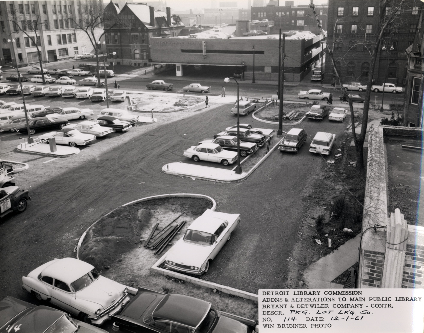 View of automobiles parked in unpaved parking lot, Main Library, Detroit Public Library during construction. Parking structure in background. Printed on front: "Detroit Library Commission. Addns & alterations to Main Public Library. Bryant & Detwiler Company, contr. Descr. pkg. lot lkg. so. No. 114. Date: 12-1-61. Win Brunner, photo."