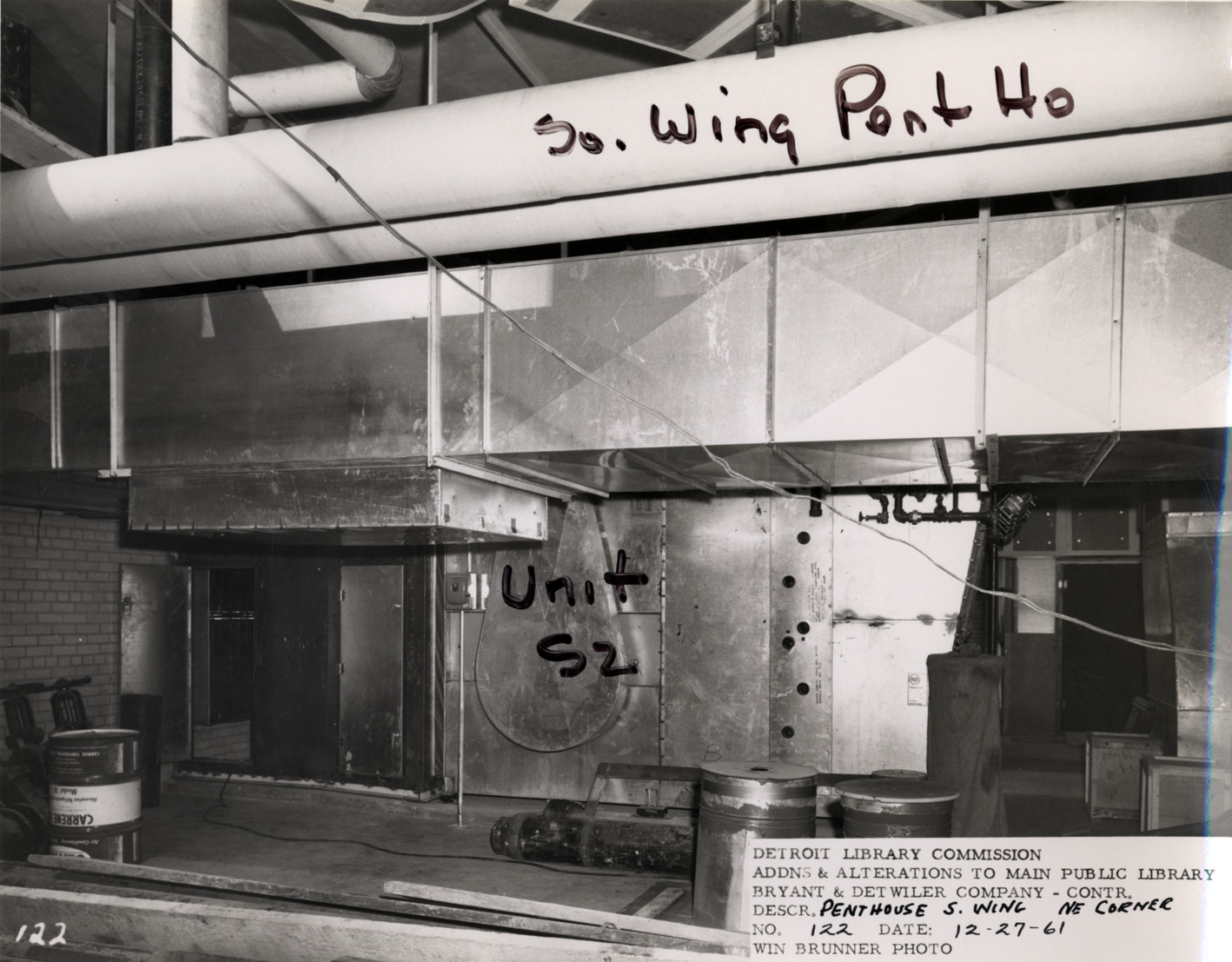 View of air handling unit in penthouse, South Wing, Main Library, Detroit Public Library during construction. Handwritten on front: "So. Wing, pentho., unit S2." Printed on front: "Detroit Library Commission. Addns & alterations to Main Public Library. Bryant & Detwiler Company, contr. Descr. penthouse, S. Wing, ne corner. No. 122. Date: 12-27-61. Win Brunner, photo."