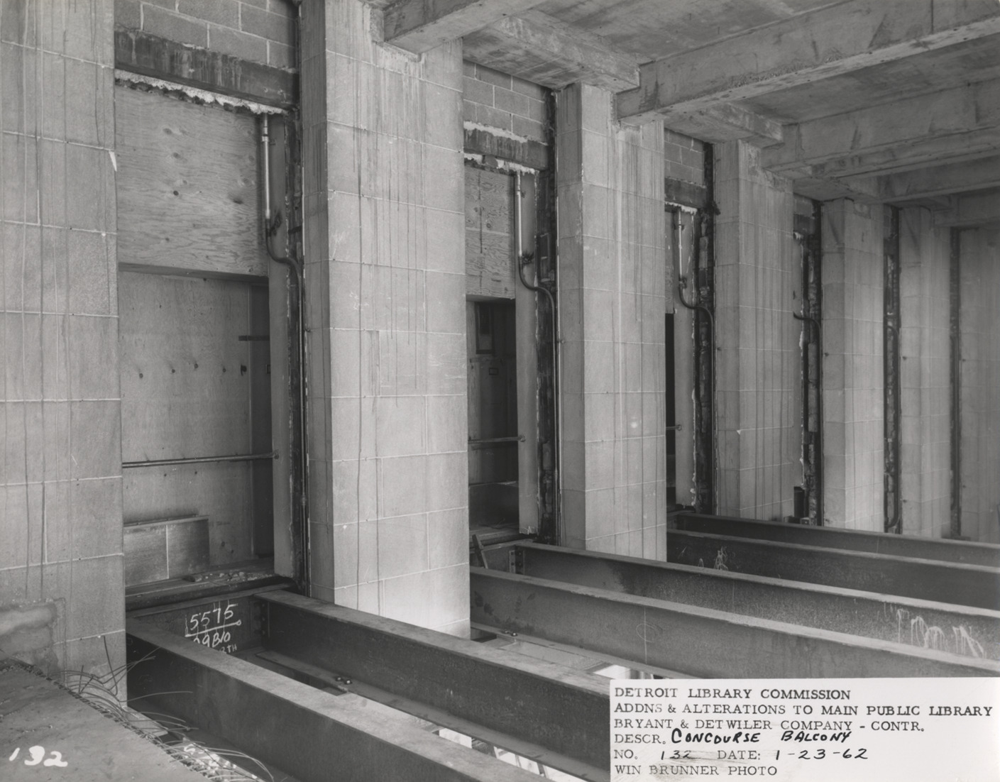 View of concourse balcony, Main Library, Detroit Public Library during construction. Printed on front: "Detroit Library Commission. Addns & alterations to Main Public Library. Bryant & Detwiler Company, contr. Descr. concourse balcony. No. 132. Date: 1-23-62. Win Brunner, photo."