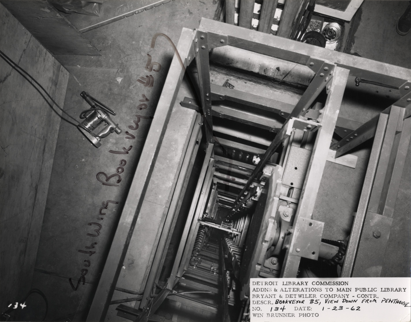 View looking down into book elevator or dumbwaiter shaft in South Wing, Main Library, Detroit Public Library from penthouse. Handwritten on front: "South Wing bookveyor #5." Printed on front: "Detroit Library Commission. Addns & alterations to Main Public Library. Bryant & Detwiler Company, contr. Descr. bookveyor #5, view down from penthouse. No. 134. Date: 1-23-62. Win Brunner, photo."