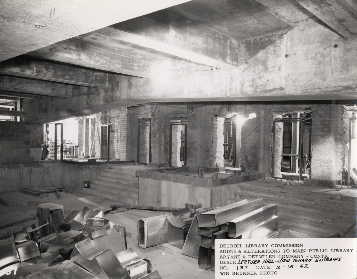 View of entrance to lecture hall, Main Library, Detroit Public Library during construction. Sections of ducts in foreground. Printed on front: "Detroit Library Commission. Addns & alterations to Main Public Library. Bryant & Detwiler Company, contr. Descr. lecture hall, view toward entrance. No. 137. Date: 2-15-62. Win Brunner, photo." Handwritten on back: "Lecture hall, CA 36."