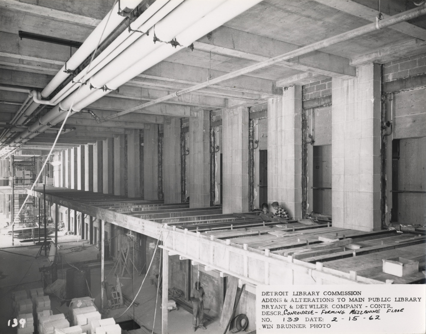 View of mezzanine floor, concourse, Main Library, Detroit Public Library during construction. Construction workers on site; construction materials on lower level. Printed on front: "Detroit Library Commission. Addns & alterations to Main Public Library. Bryant & Detwiler Company, contr. Descr. concourse, forming mezzanine floor. No. 139. Date: 2-15-62. Win Brunner, photo."