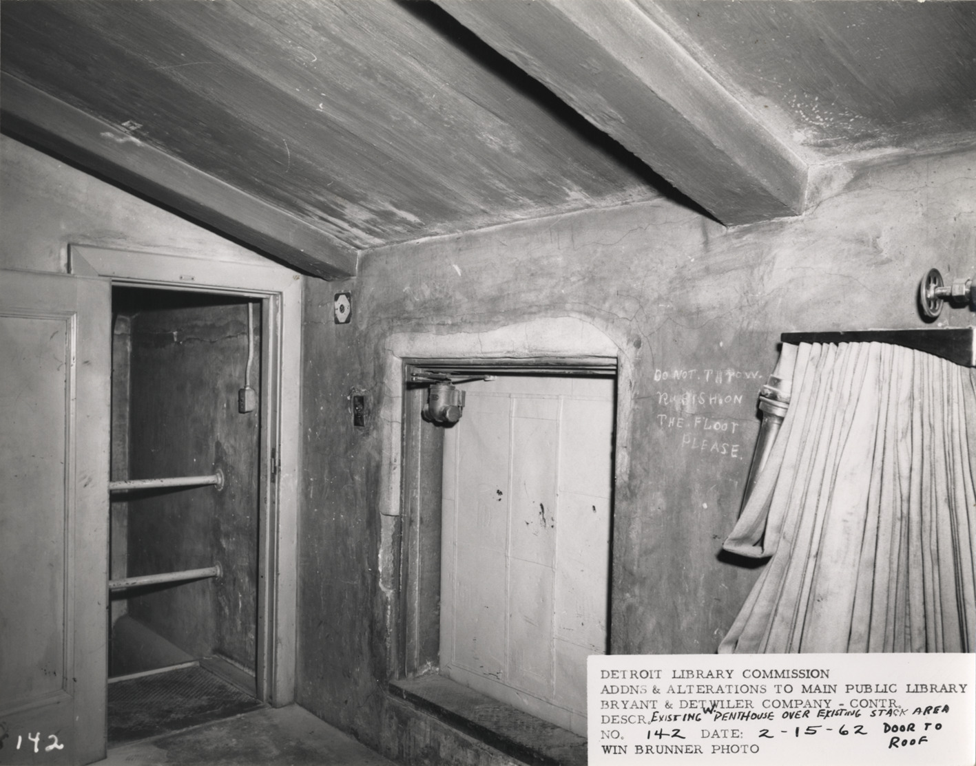 Interior view of door to roof in penthouse, Main Library, Detroit Public Library. Fire hose on right; handwritten on wall: "Do not throw rubish [sic] on the floor please." Printed on front: "Detroit Library Commission. Addns & alterations to Main Public Library. Bryant & Detwiler Company, contr. Descr. existing w. penthouse over existing stack area, door to roof. No. 142. Date: 2-15-62. Win Brunner, photo."