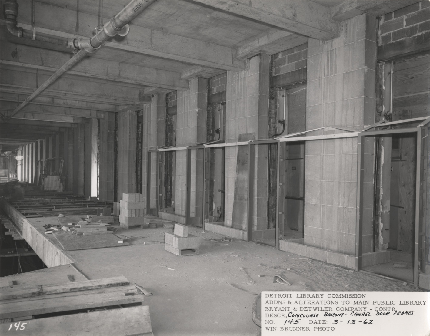View of concourse balcony with study carrel door frames, Main Library, Detroit Public Library during construction. Printed on front: "Detroit Library Commission. Addns & alterations to Main Public Library. Bryant & Detwiler Company, contr. Descr. concourse balcony, carrel door frames. No. 145. Date: 3-13-62. Win Brunner, photo."