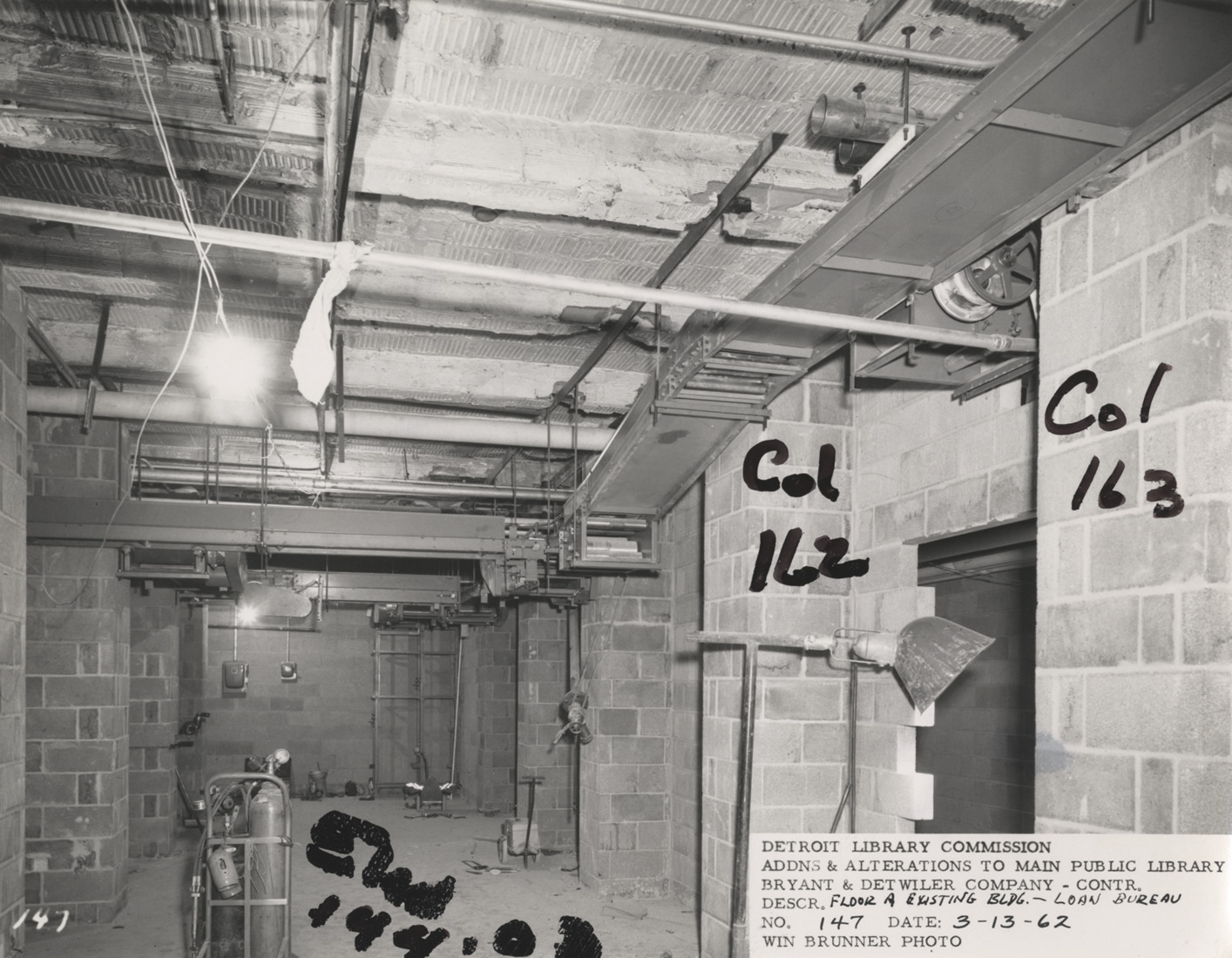 View of Loan Bureau, Main Library, Detroit Public Library during construction. Handwritten on center columns: "Col 162" and " Col 163." Handwritten on front: "Elev. 144.03." Printed on front: "Detroit Library Commission. Addns & alterations to Main Public Library. Bryant & Detwiler Company, contr. Descr. floor A, existing bldg., Loan Bureau. No. 147. Date: 3-13-62. Win Brunner, photo." Handwritten on back: "Loan Bureau EA/51 within the existing bldg."
