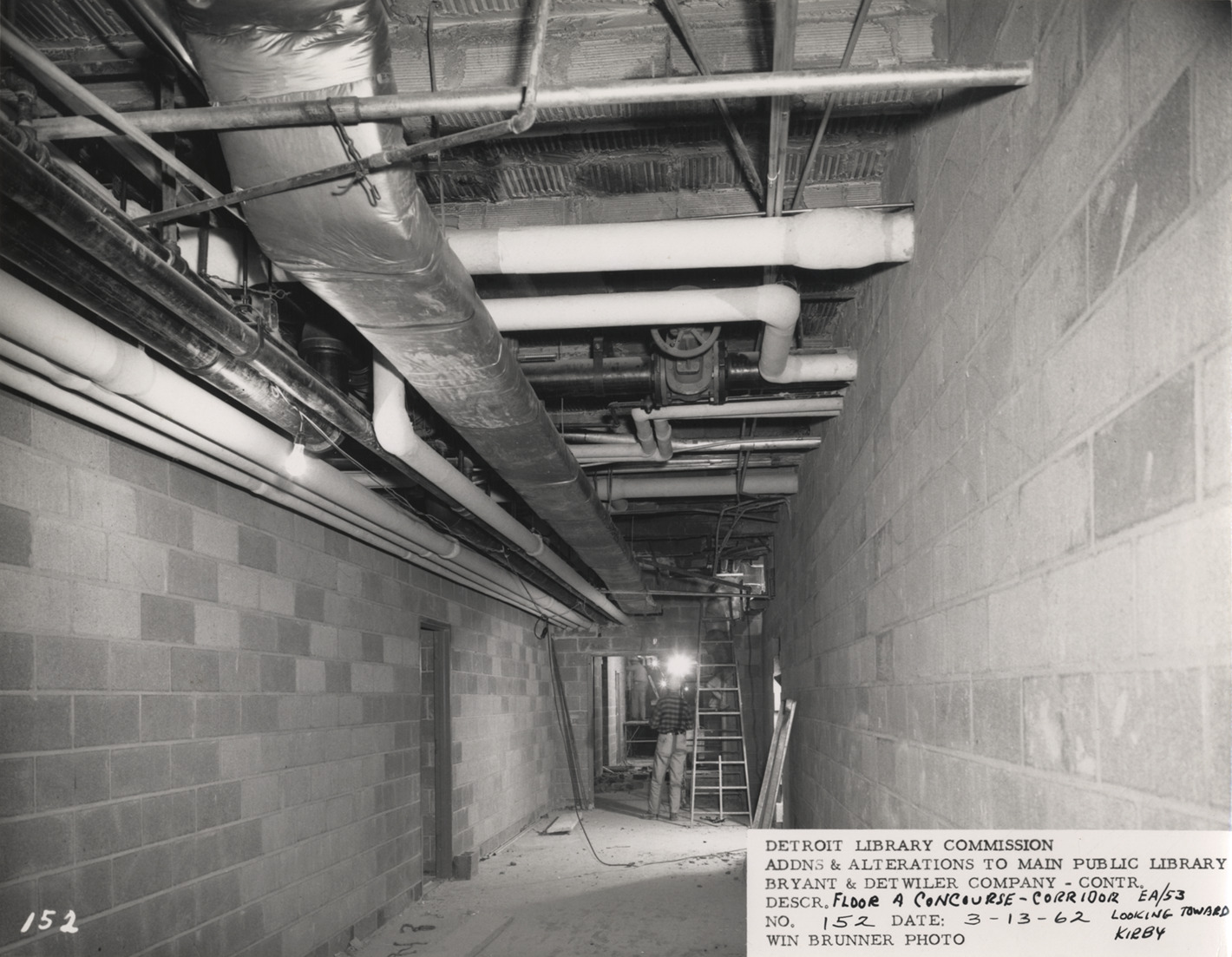 View of concourse corridor on A level, Main Library, Detroit Public Library during construction. Ductwork overhead; construction workers with ladder at end of corridor. Printed on front: "Detroit Library Commission. Addns & alterations to Main Public Library. Bryant & Detwiler Company, contr. Descr. floor A concourse, corridor EA/53 looking toward Kirby. No. 152. Date: 3-13-62. Win Brunner, photo."