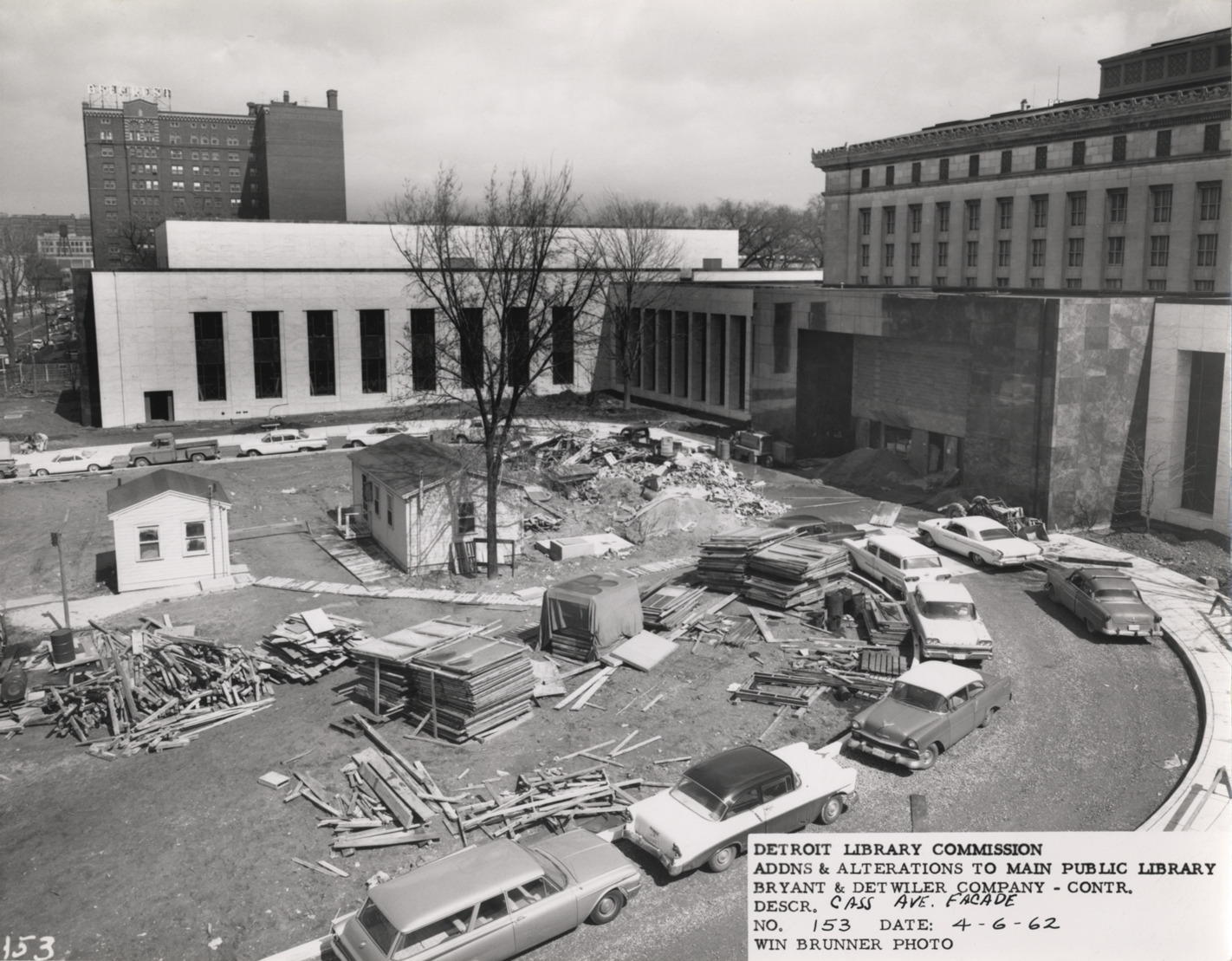 View of Cass Ave. entrance and North Wing, Main Library, Detroit Public Library during construction. Cars and trucks parked in semicircular drive; construction site in center. Printed on front: "Detroit Library Commission. Addns & alterations to Main Public Library. Bryant & Detwiler Company, contr. Descr. Cass Ave. facade. No. 153. Date: 4-6-62. Win Brunner, photo."