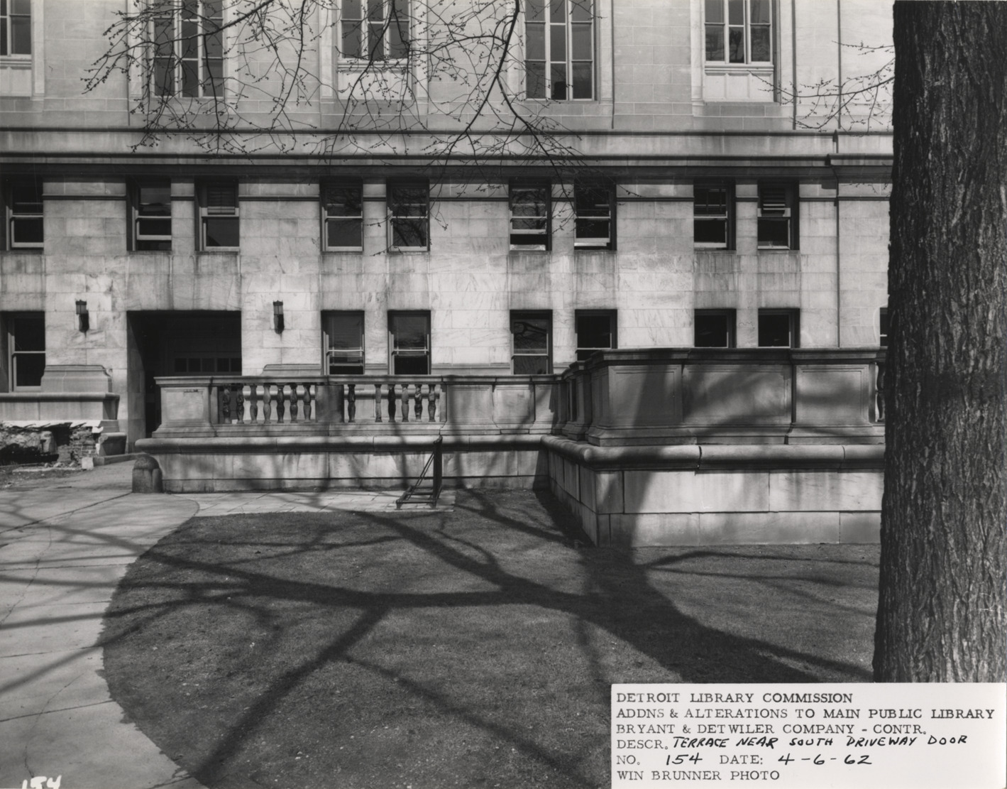 View of terrace near south driveway door, Main Library, Detroit Public Library. Balustrade surrounds terrace. Printed on front: "Detroit Library Commission. Addns & alterations to Main Public Library. Bryant & Detwiler Company, contr. Descr. terrace near south driveway door. No. 154. Date: 4-6-62. Win Brunner, photo."