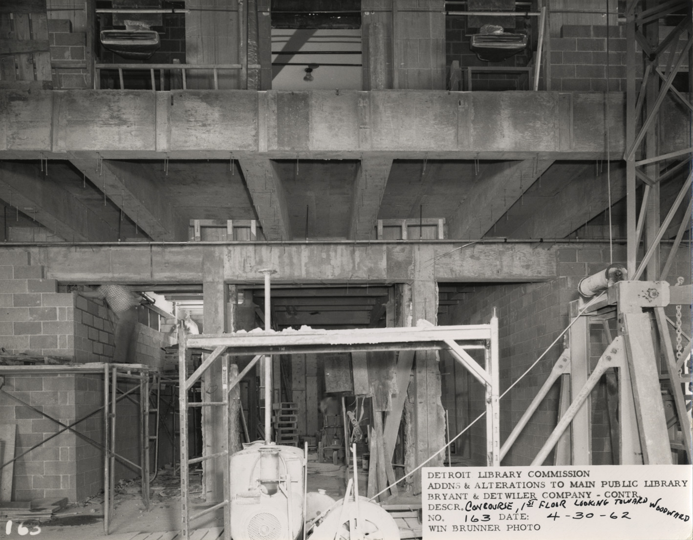 View of first floor of concourse, Main Library, Detroit Public Library during construction. Printed on front: "Detroit Library Commission. Addns & alterations to Main Public Library. Bryant & Detwiler Company, contr. Descr. concourse, 1st floor looking toward Woodward. No. 163. Date: 4-30-62. Win Brunner, photo."