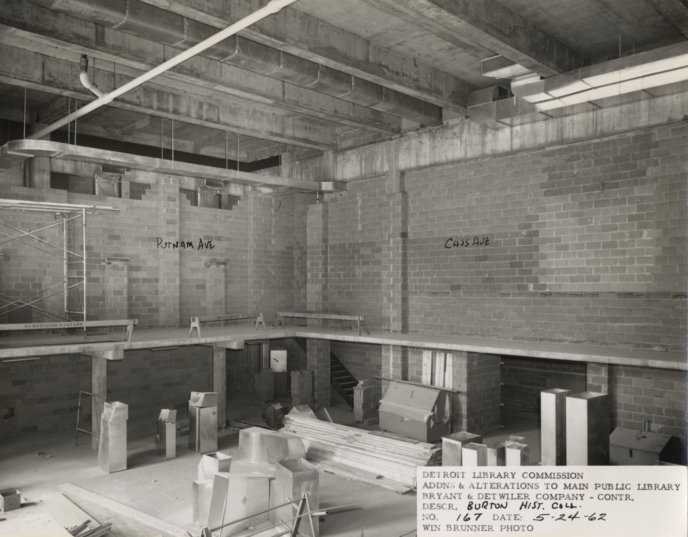 View of Burton Historical Collection, Main Library, Detroit Public Library during construction. Sawhorses on balcony; lumber and sections of ducts on floor. Handwritten on front: "Putnam Ave.; Cass Ave." Printed on front: "Detroit Library Commission. Addns & alterations to Main Public Library. Bryant & Detwiler Company, contr. Descr. Burton Hist. Coll. No. 167. Date: 5-24-62. Win Brunner, photo."