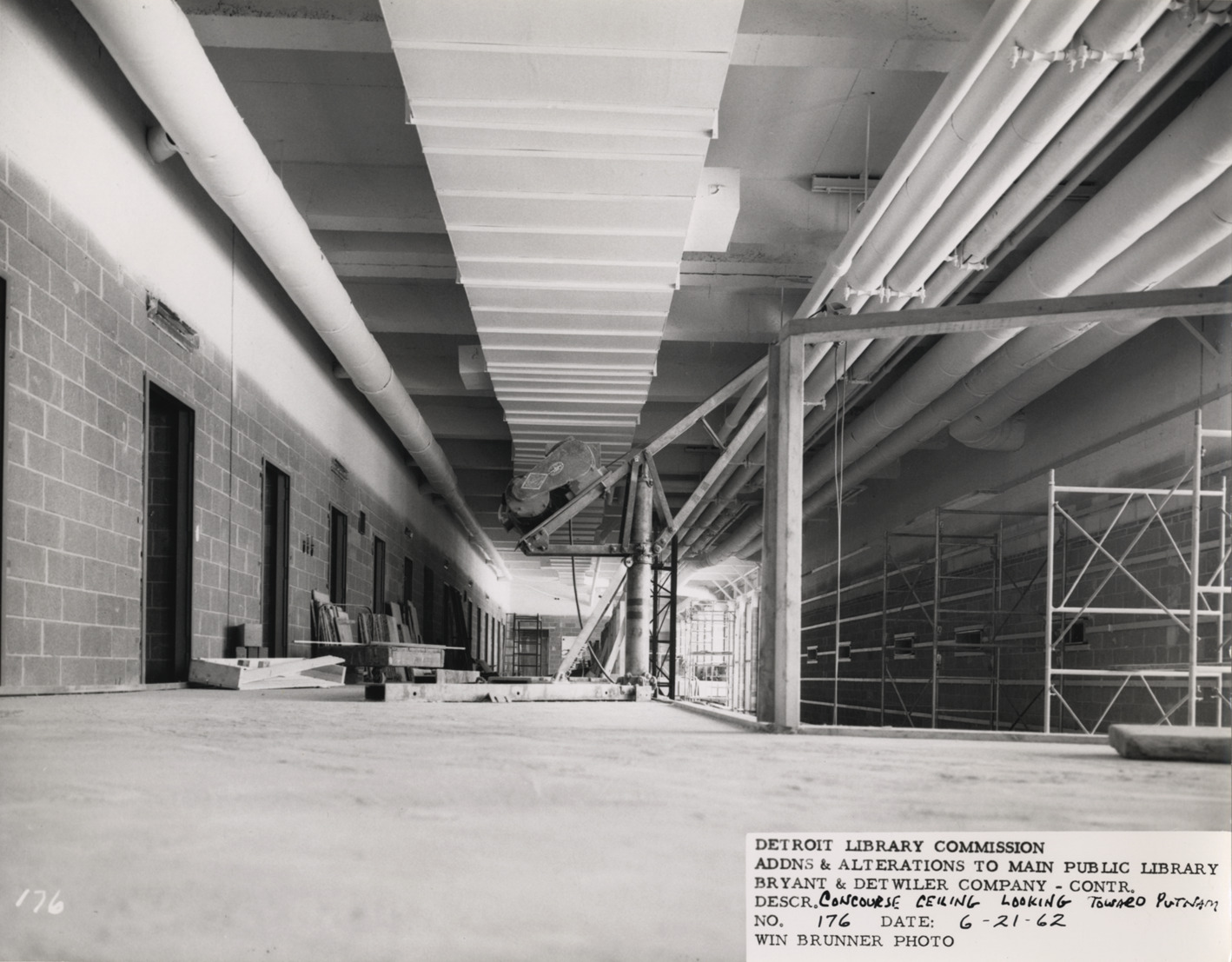 View of concourse ceiling, Main Library, Detroit Public Library under construction. Pipes and ductwork overhead. Study carrel entrances on left; scaffolding on right. Printed on front: "Detroit Library Commission. Addns & alterations to Main Public Library. Bryant & Detwiler Company, contr. Descr. concourse ceiling looking toward Putnam. No. 176. Date: 6-21-62. Win Brunner, photo."