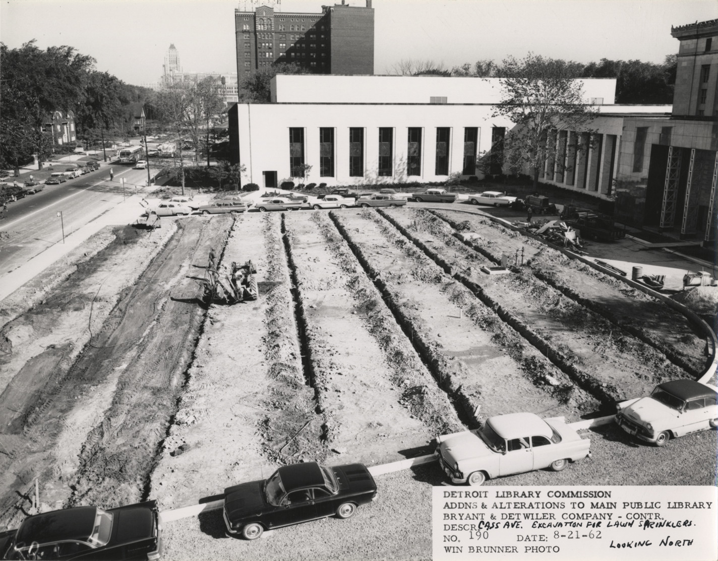 View of Cass Avenue lawn being excavated for lawn sprinklers at Main Library, Detroit Public Library. Automobiles parked in driveway; tractor in center of area. Printed on front: "Detroit Library Commission. Addns & alterations to Main Public Library. Bryant & Detwiler Company, contr. Descr. Cass Ave. excavation for lawn sprinklers, looking north. No. 190. Date: 8-21-62. Win Brunner, photo."