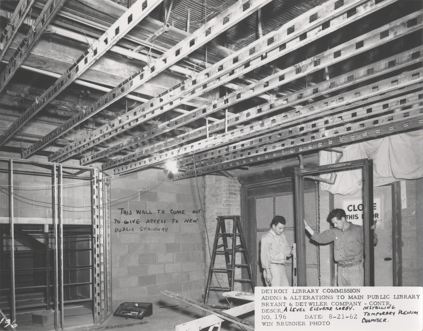 View of two construction workers working on elevator lobby, Main Library, Detroit Public Library. Handwritten on front: "This wall to come out to give access to new public stairway." Printed on front: "Detroit Library Commission. Addns & alterations to Main Public Library. Bryant & Detwiler Company, contr. Descr. A level elevator lobby, installing temporary plenum chamber. No. 196. Date: 8-21-62. Win Brunner, photo."